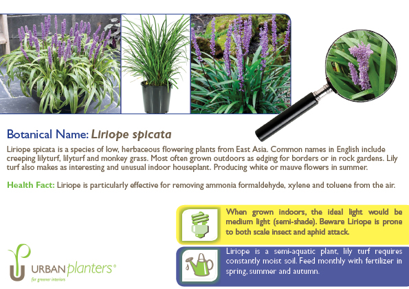 Health Fact: Liriope is particularly effective for removing ammonia formaldehyde, xylene and toluene from the air.