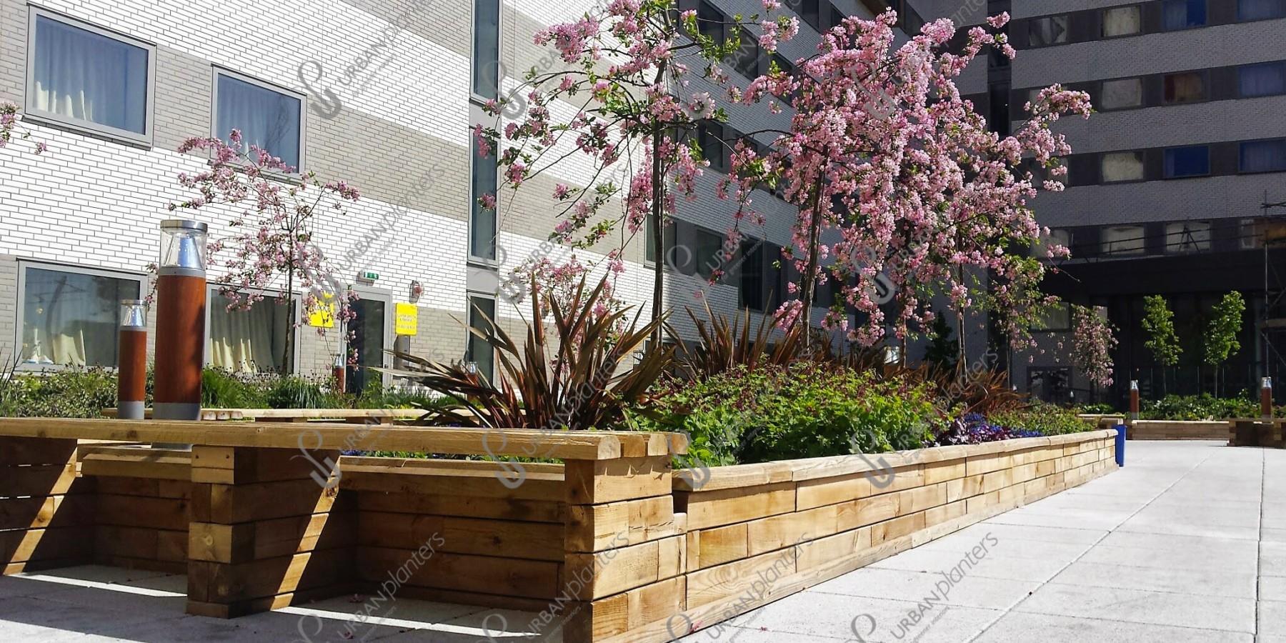 Altogether, UrbanPlanters and WoodBlocX created 10 raised beds, incorporating lighting and 20 seating areas and the resulting scheme creates a peaceful breakout area for the students, full of colour and interest, without stealing the show from the breath-taking backdrop.